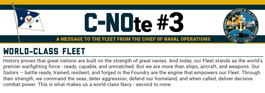 Chief of Naval Operations Admiral Caudle released C NOte #3: World Class Fleet, underscoring the Navy’s unmatched warfighting strength and the Sailors who power it. He introduced a new “Hedge Strategy” to strengthen general purpose forces through tailored offsets, modular platforms, and integrated all domain capabilities designed to outpace evolving threats. The note emphasizes sustained investment, refined command structures, and readiness across critical missions to deter aggression and deliver decisive combat power. Continuous improvement is being advanced through Fleet Improvement Offices (FIOs) under the Office of Warfighting Advantage (OWA), scaling best practices across the Foundry, Fleet, and Fight.